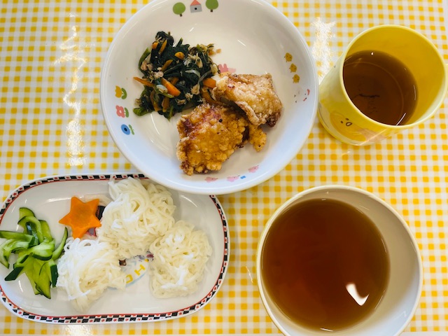 給食 7月7日の給食🎋💫 2025.07.07 今日の給食は、 ✅唐揚げ ✅海苔和え ✅にゅうめん でした! あおぐみさんは、唐揚げ、海苔和え、そうめんです!✨️🎋 七夕に、素麺を食べる風習がありますが、その理由はそうめんが天の川に似ているからと言われています✨️🎋 おやつは、星型クッキーでした✨★ みんなたくさん食べてくれました✨️ 7月2日の給食 前の記事 🌟星みーつけた!🌟 次の記事