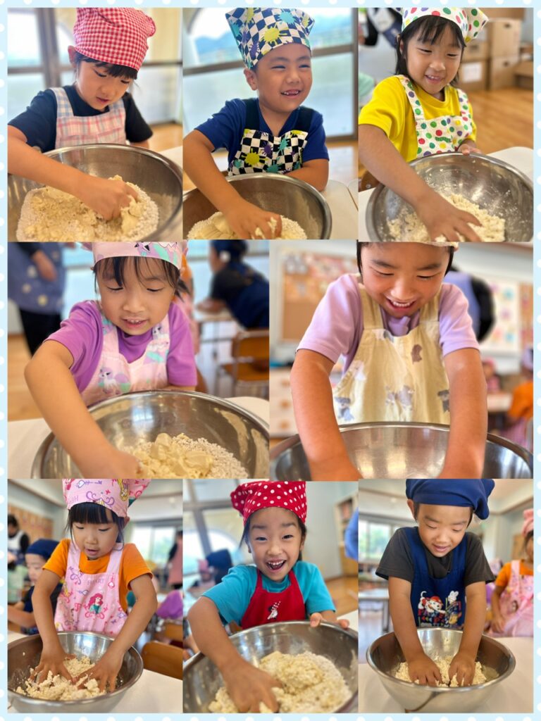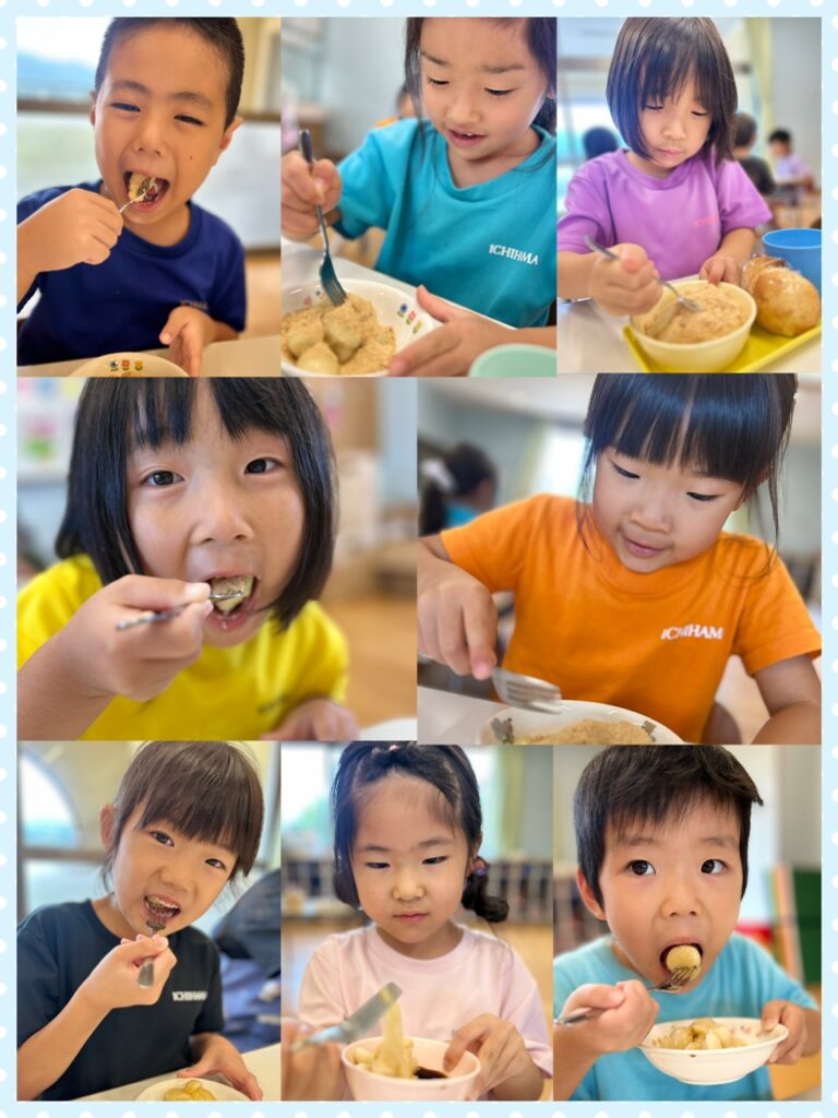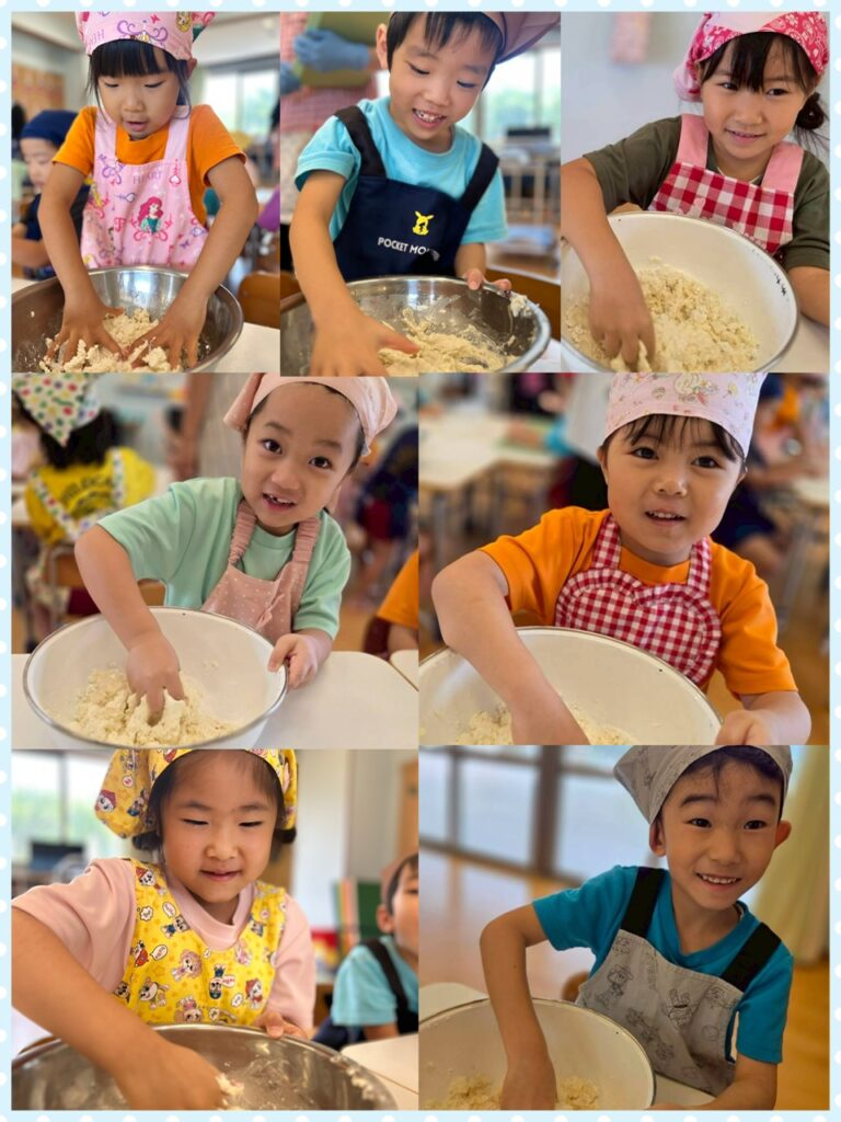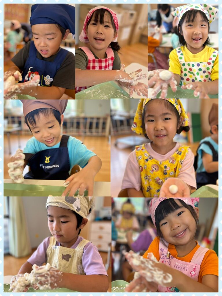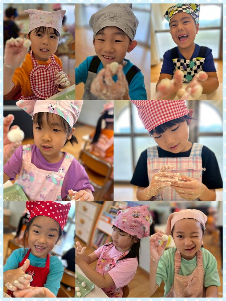 今回お団子を作るのに使った材料は、お豆腐と白玉粉です!!あお組さんになって小麦粉粘土を何度かしていることもあり、容量をつかんで出来る子がほとんど😳✨ ちょっとべちょべちょになっていると、子ども達の方から「粉がいるかもしれん!!」という声があがってきました(笑)🤣 丸める際はどうしても15にしたい!!という子が多く、自分で量を調節しながら綺麗に丸めることができました💗 おやつの時間に自分達で作ったお団子を食べました😋 たくさんあったはずのお団子もペロッと完食したあお組さん🥰 とっても楽しいクッキングになりました🤍 次は何を作ろうかなぁ💭