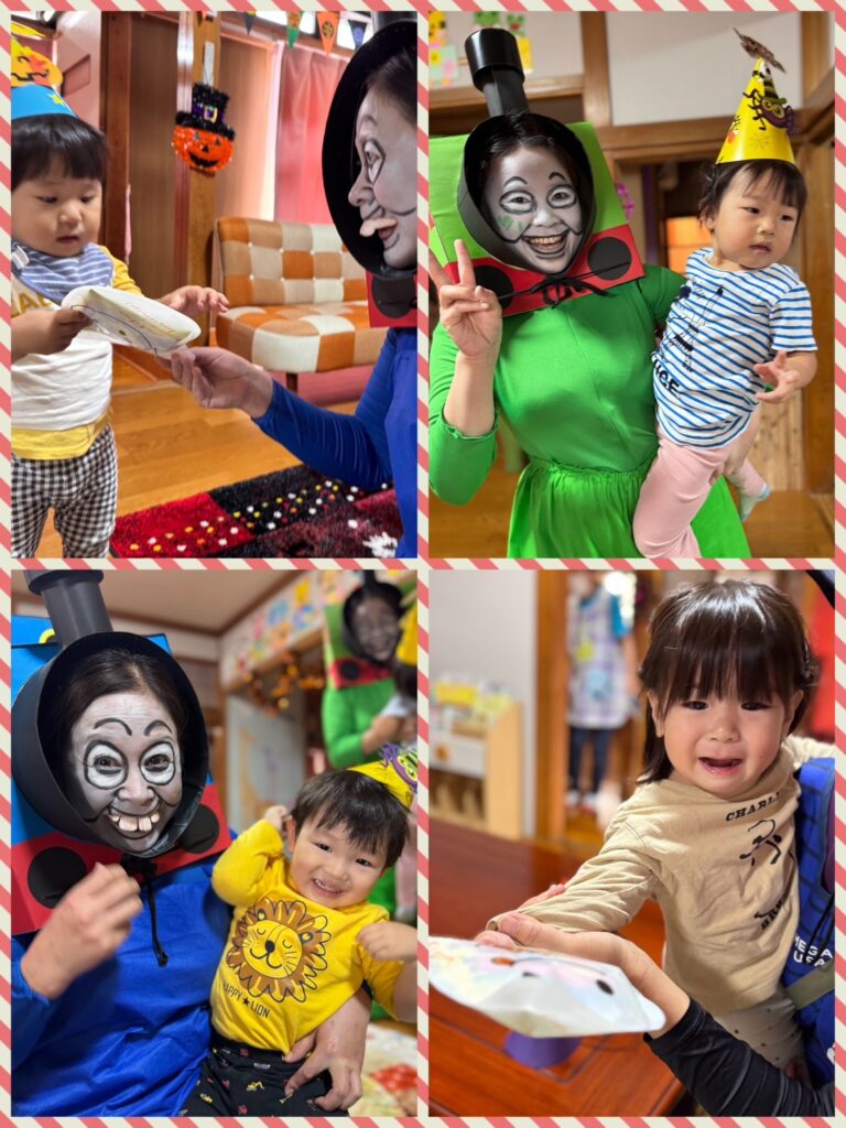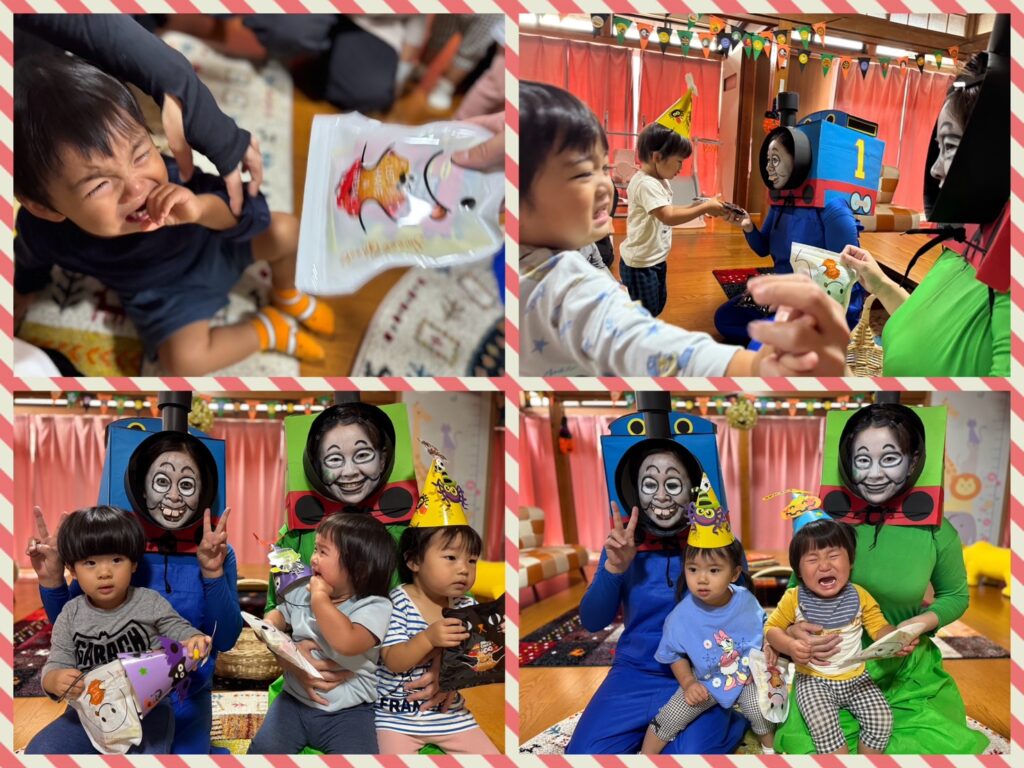初めはハロウィンの装飾がされたお部屋に喜んでいた子どもたちでしたが、いざトーマスとパーシーに会うと驚いて固まったり、泣いちゃったり、嬉しくて笑顔になったりと様々な表情の子どもたちでした😂 最後にトーマスとパーシーからお菓子を貰い、こども園に戻りました。ちょっと恐くて驚いちゃったけど、楽しいハロウィンになりました🎃💫