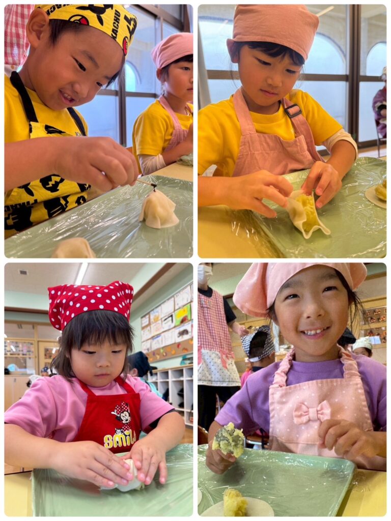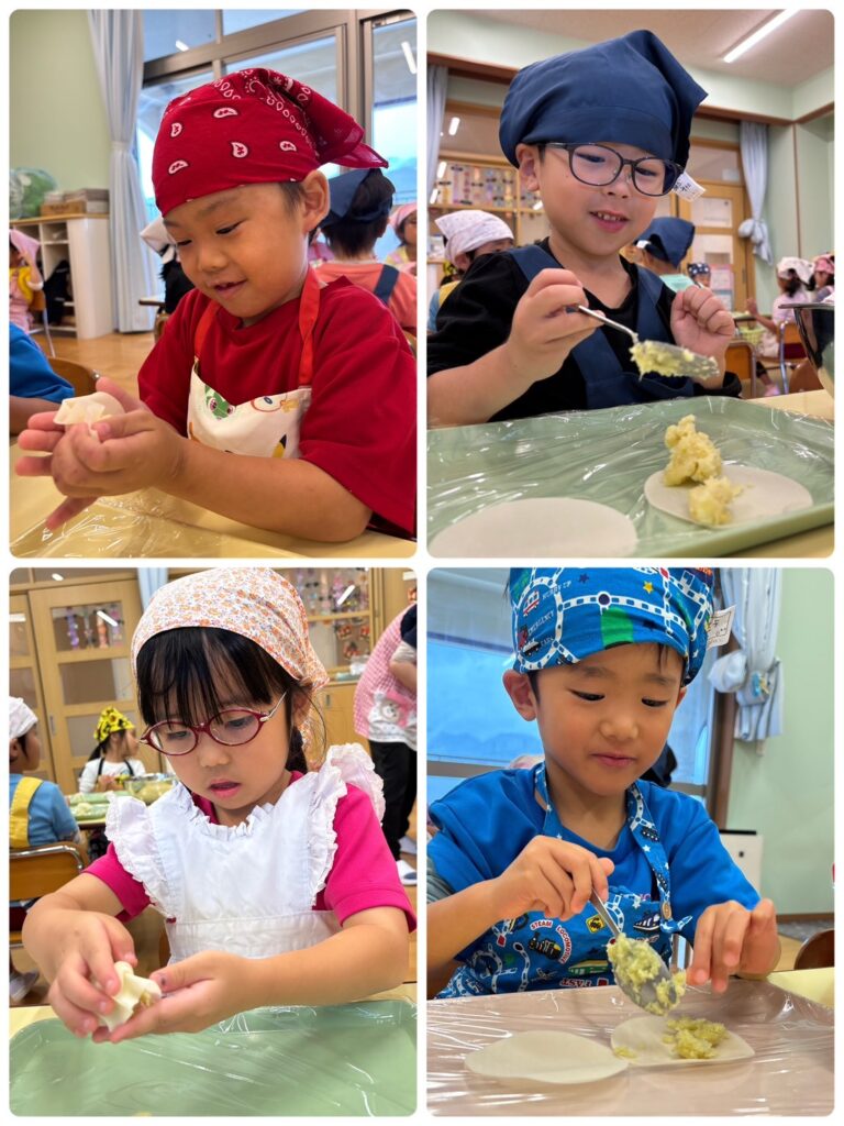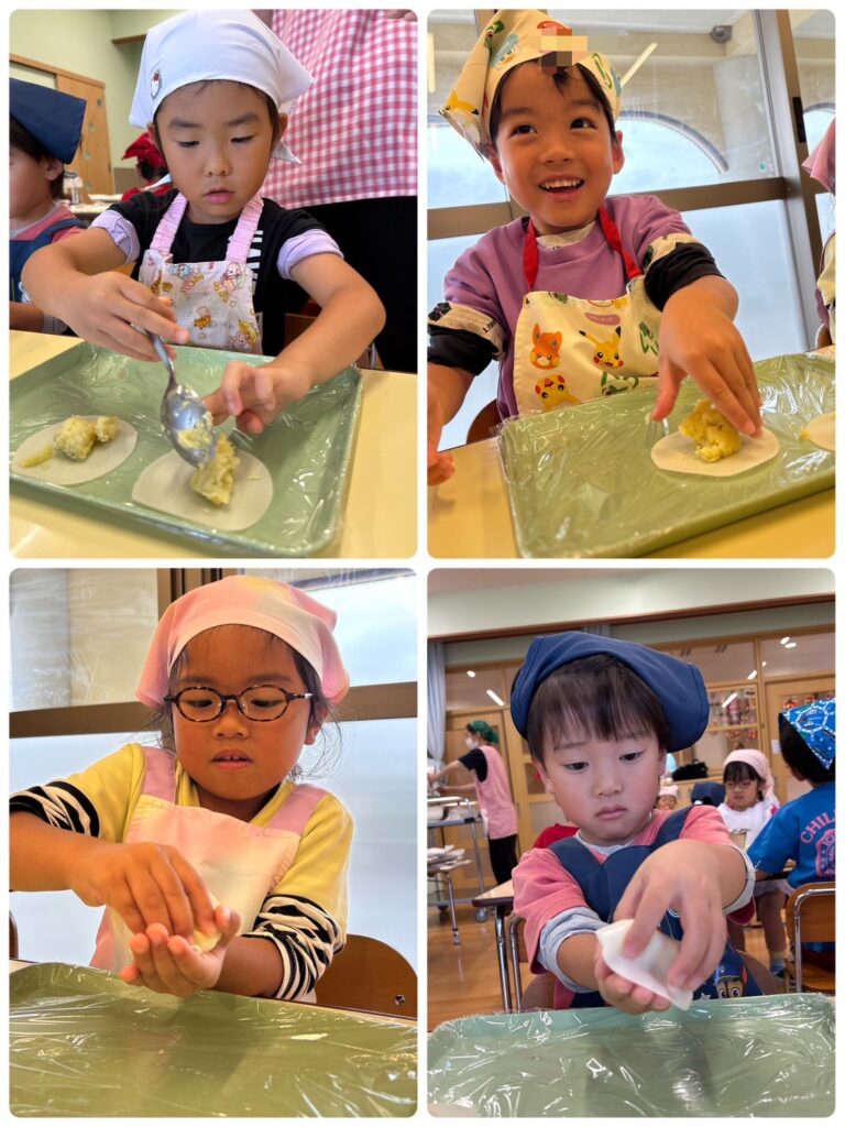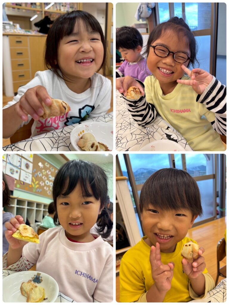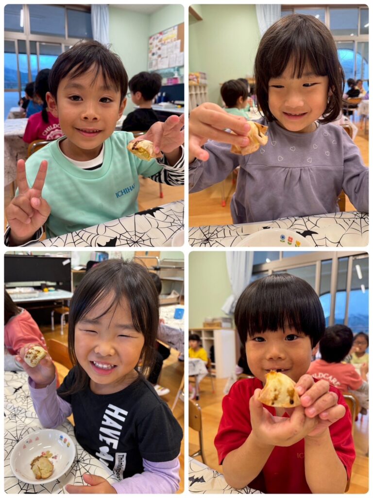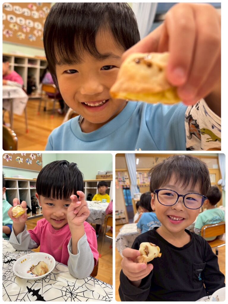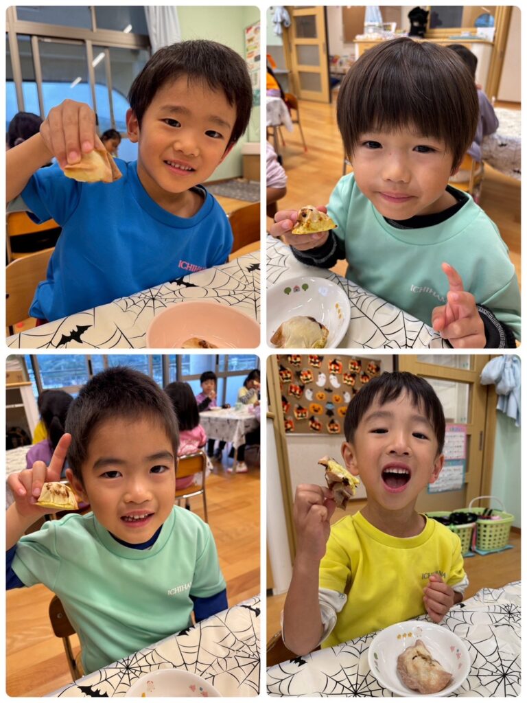 餃子の皮にスイートポテトを包むのが難しくなかなか包むことができませんでした😖💦しかし、給食の先生の話を聞きコツを教えてもらうと上手に包むことができるようになりました😊皆、5つ目や1つ目などのおばけの顔を描いていて、オリジナルのおばけが完成しました✨
