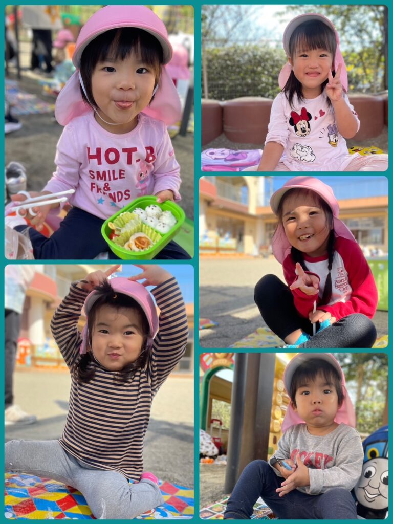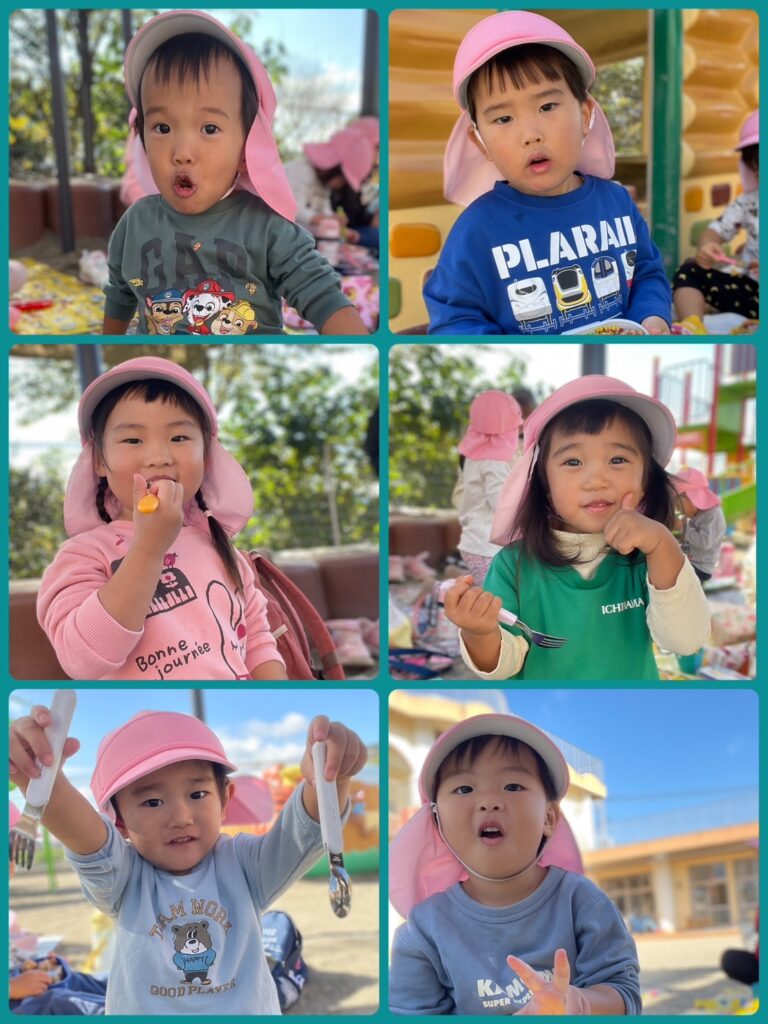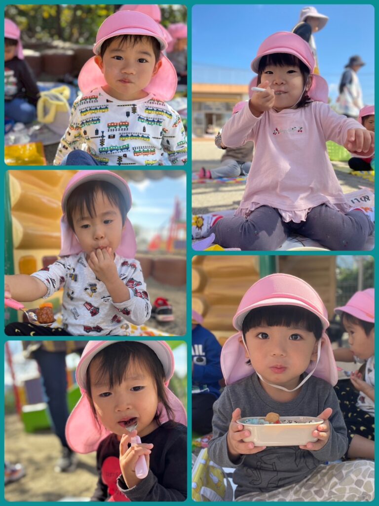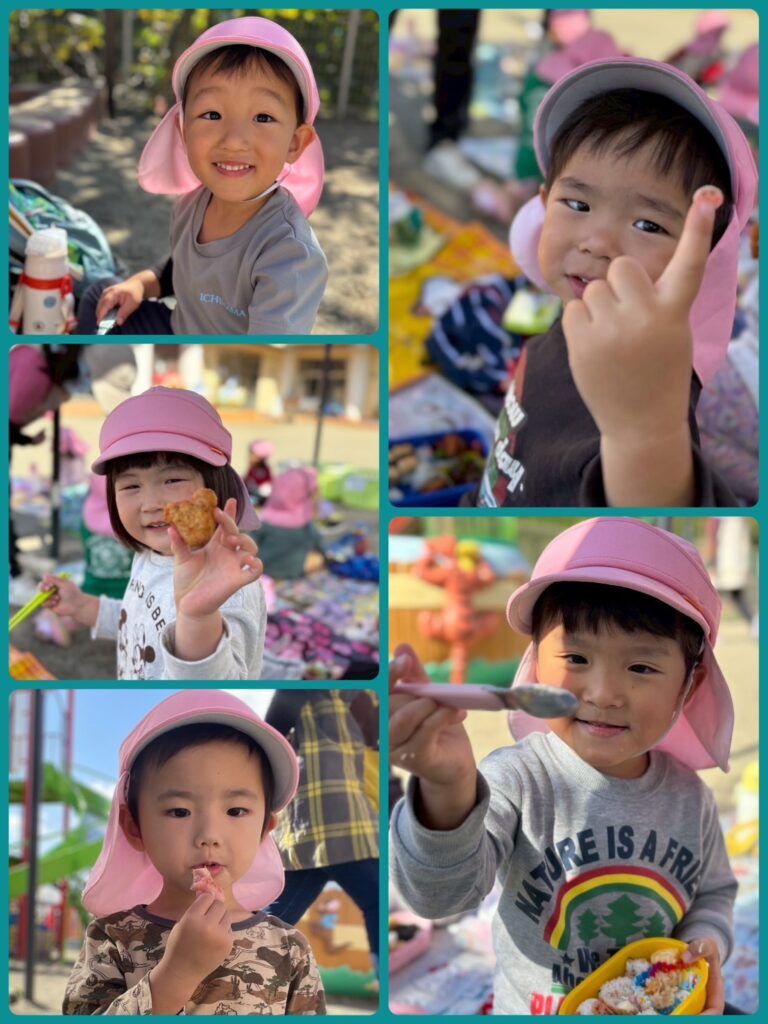 ワクワクした表情でお弁当箱を開ける子どもたち😆「見て見て〜」とお友だちと見せ合いっこしたり、「唐揚げ入ってる!」など嬉しそうな声が園庭に響き渡りました💕✨