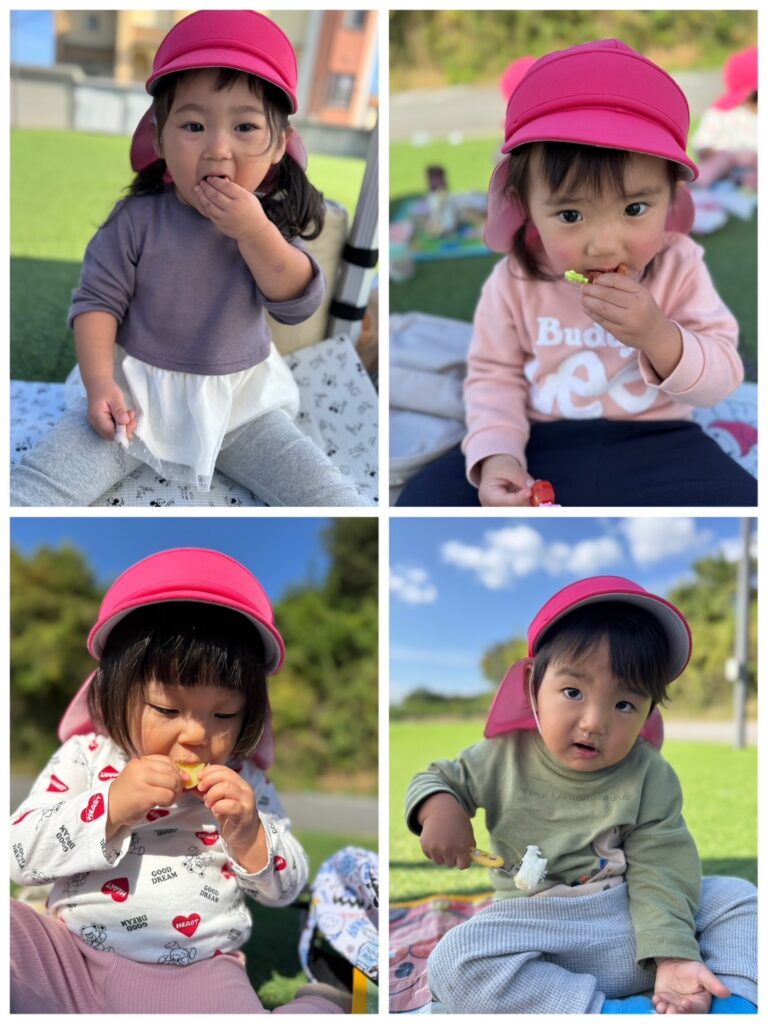 天気が良かったので、お弁当はグランドの芝生の上にシートを敷いて食べました🍙✨ いつもと違う雰囲気の中、お友だちや先生とお話しながら美味しくお弁当を食べました😋