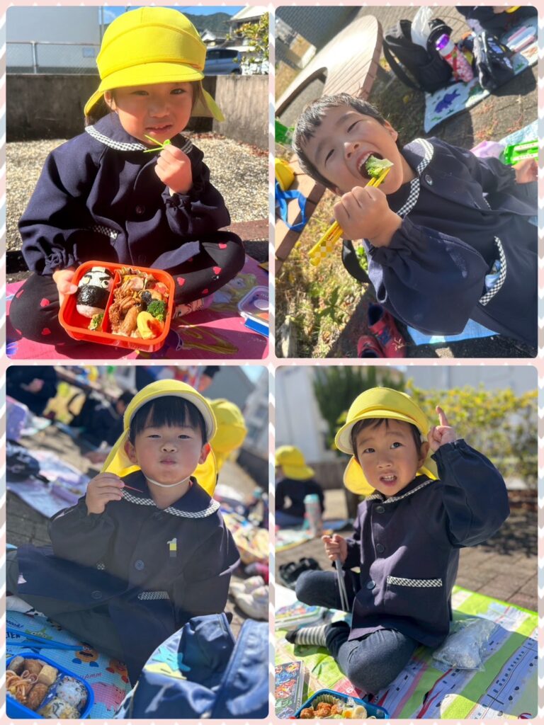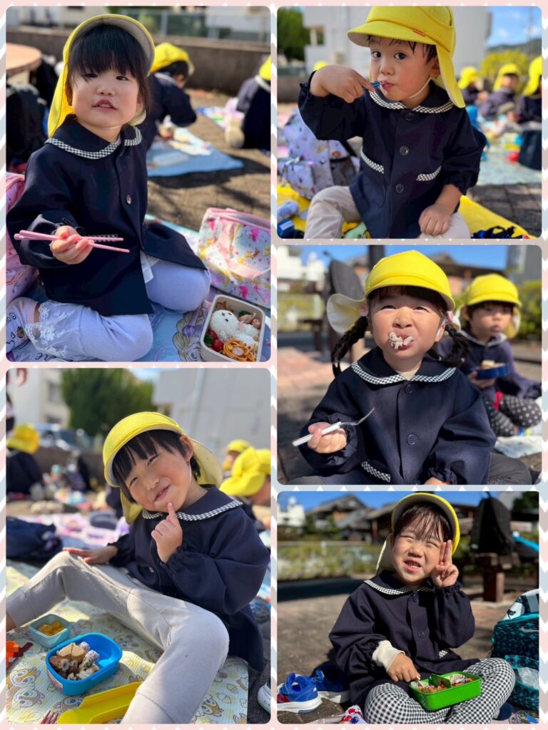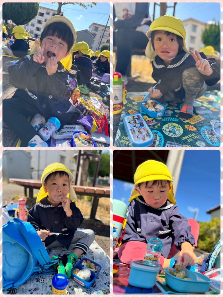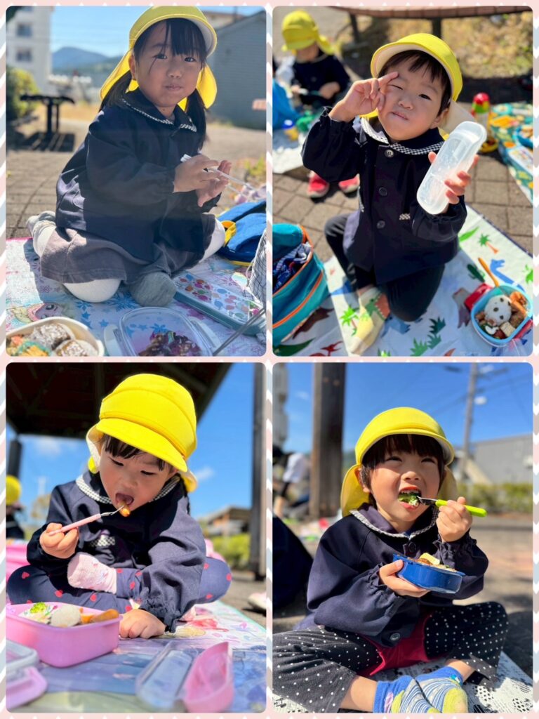公園では遊具で時間いっぱい沢山遊び、楽しみにしていたお弁当とお菓子を食べました。持参のシートに座って青空の下みんなで食べるお弁当はとっても美味しかったね😋☀️