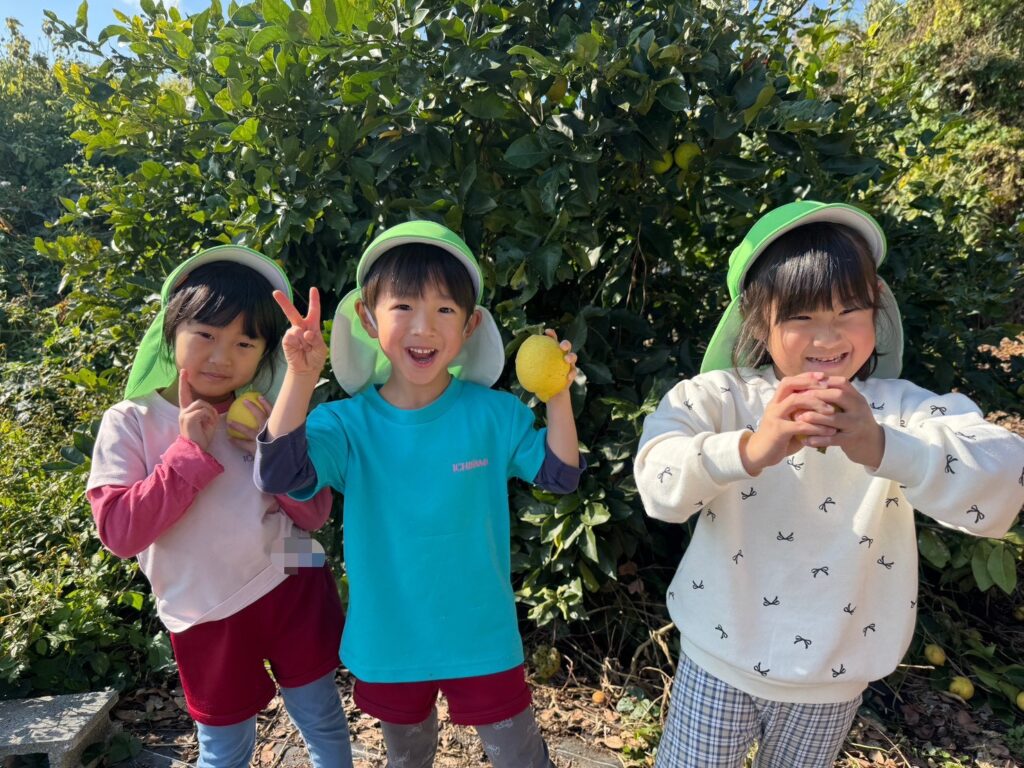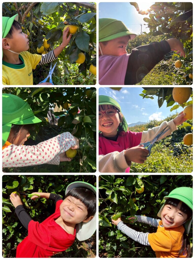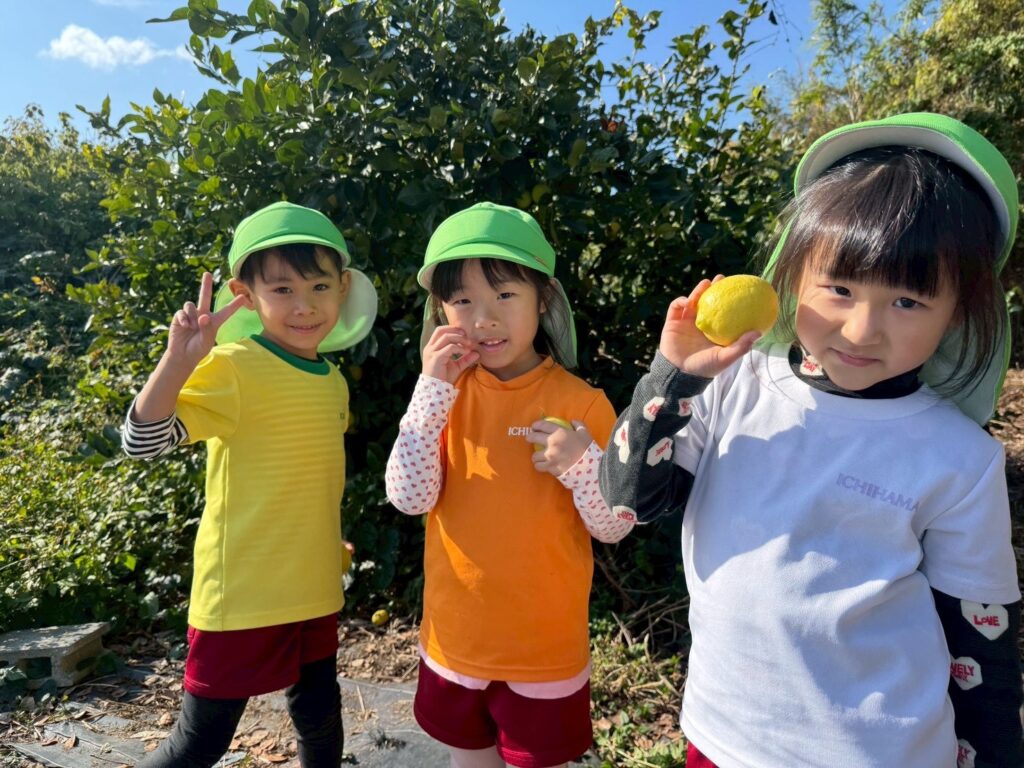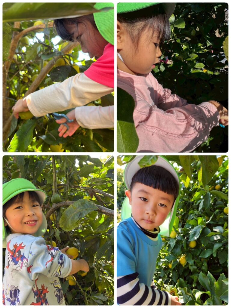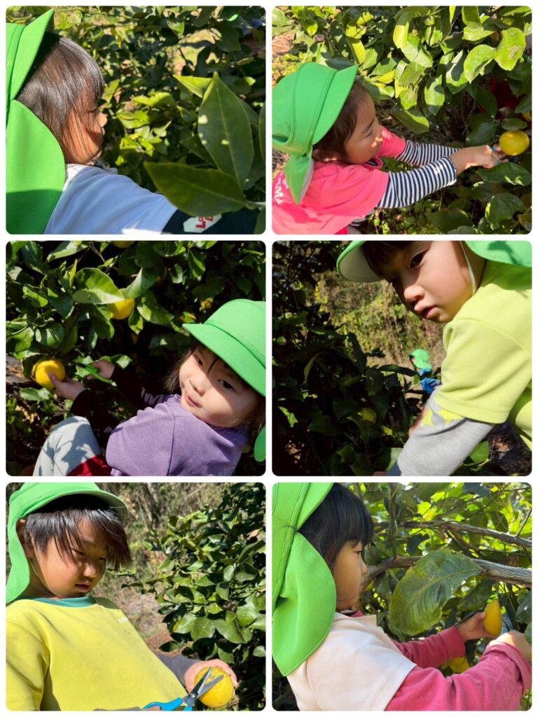 みどり組 レモン狩り🍋🍋 2025.12.21 12月19日(金)に畑の奥にあるレモン🍋を収穫しに行きました!!安藤先生に収穫の仕方を教えてもらい、自分が気に入ったレモン🍋を見つけてとりました😁 さっそく給食の先生に調理してもらい、給食のメニューのサラダにかけて食べました😋「すっぱーい!」と言いながらレモンの果肉まで食べるみどりさんでした😁 クッキング🥞💕 前の記事