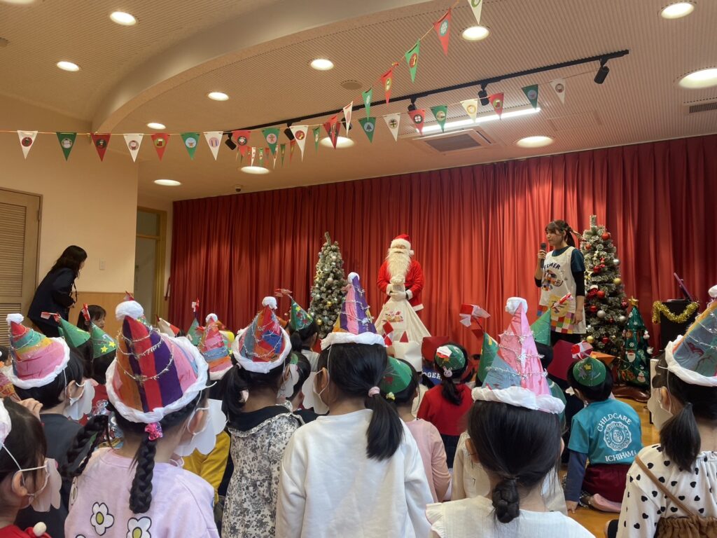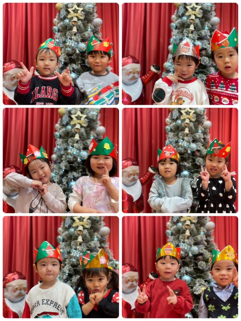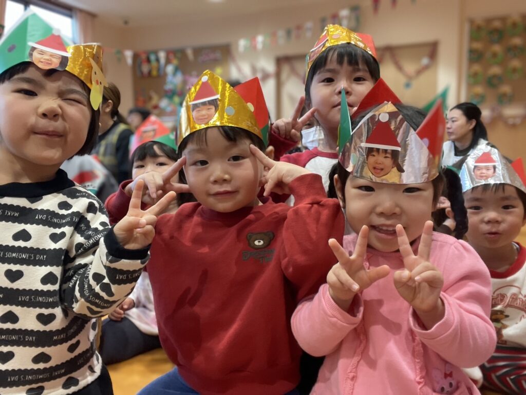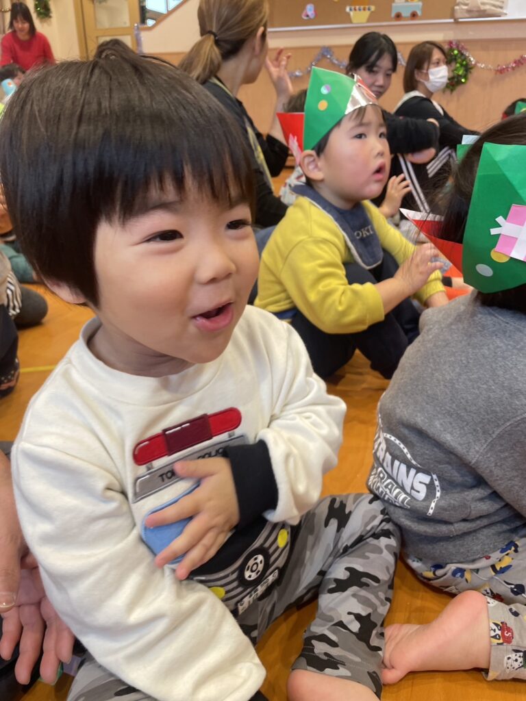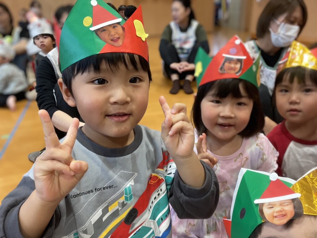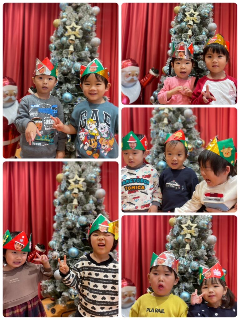 12月24日、クリスマスイブにこども園のクリスマス会をしました!子どもたちは好きな服を選んで着てきてくれました✨ 嬉しさからお友だちと服を見せ合いっこする子どもたち💖 自分で作った冠をかぶりクリスマス会に参加しました!