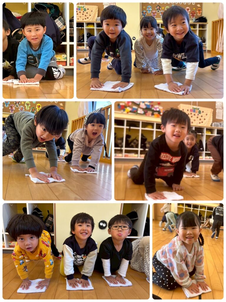 今年お世話になったきいろ組の保育室をみんなで大掃除しました☺️床を雑巾がけしたり、ロッカーの中を拭いてピカピカにしました☀️