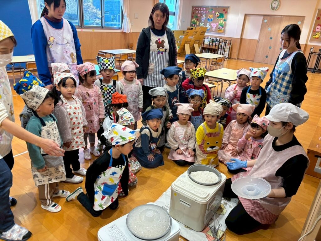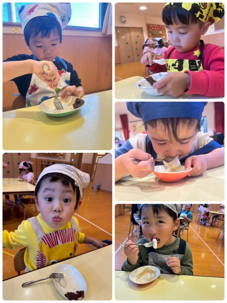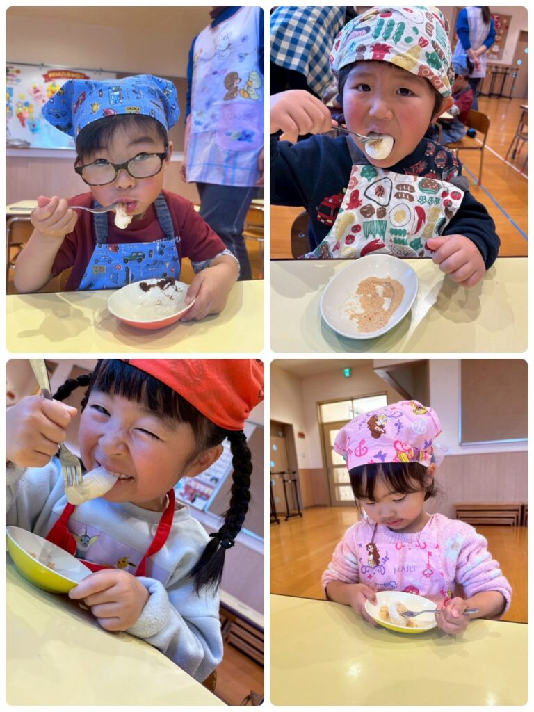 次の日は本物のお餅を食べました🤩お餅が出来るまでを見学して、出来立てのお餅に好きな具材をかけて食べました✨とっても美味しかったので、ほとんどの子が3回も4回もおかわりに来て、楽しく美味しく食べることができました❤️