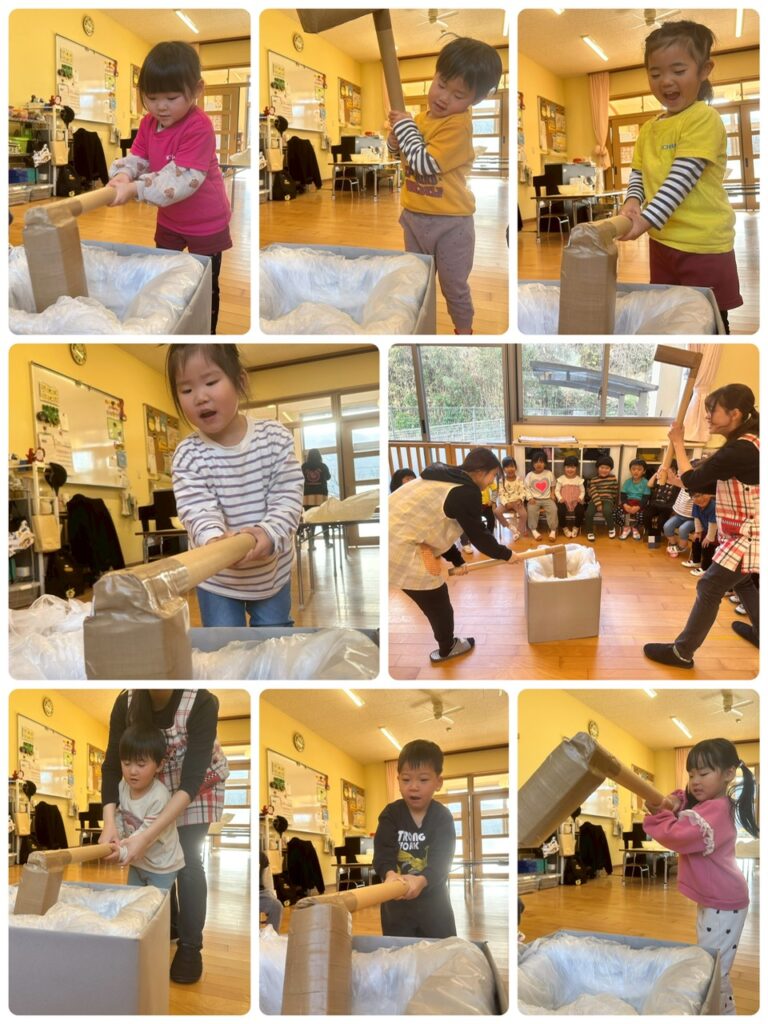 きいろ組さんで小麦粉粘土を使ったお餅つきごっこをしました✨子どもたちが考えた「よいしょっよいよいよい」という掛け声と共に小麦粉粘土をついて大盛り上がりのお餅つきごっこになりました😆🧡