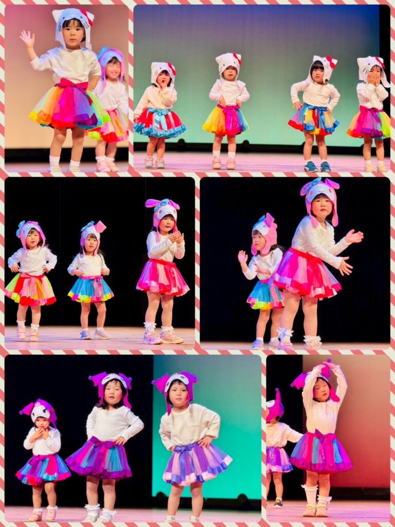 女の子は『Lucky Happy Everyday』を披露しました💖副担任手作りのかわいい被り物にテンションをあげる子どもたちでした😁🎶 女の子は曲や振りを覚えるのがとにかく早くて、練習の時から「早く踊りたいー😆」と言うほどみんなの大好きな曲になりました✨本番ではどの子も堂々と踊っていて、幕が上がった瞬間のポーズもしっかり決まっており成長を感じました😭 また、最後のポーズもみんなばっちり出来ていてとっても可愛かったです🫶 間奏での掛け声もありがとうございました♪