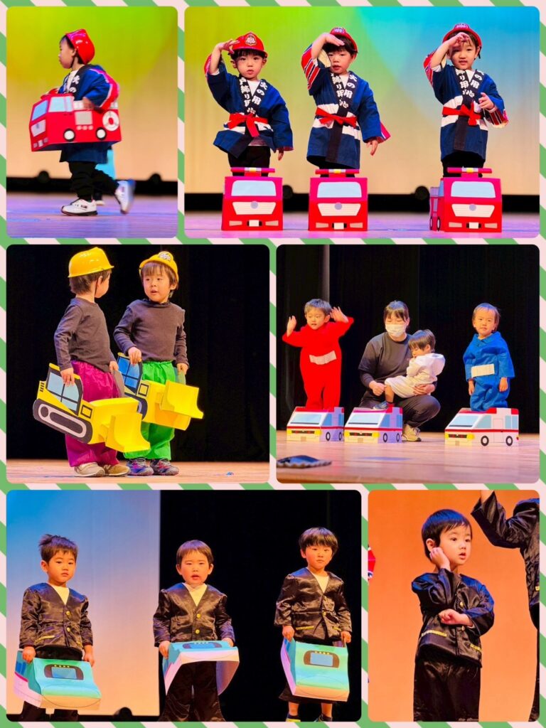 男の子は『はたらくくるま』を披露しました🛻✨隊形移動もあり、立ち位置を覚えるのに苦戦する子もいましたが、みんな最後まで頑張りました!副園長手作りの乗り物に乗って、それぞれの車にあった衣装を着てウキウキしていた男の子たちです😆🎶本番は笑いが起こる場面もありましたが、会場の皆様の温かい雰囲気の中、楽しく踊ることができました。また、幕が上がると緊張する子やお父さん・お母さんを探す子、照明が気になる子など様々な反応がみられて楽しい発表会になりました😁