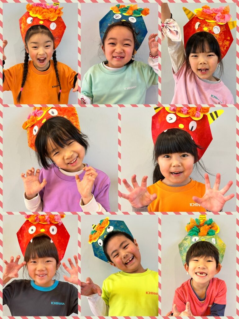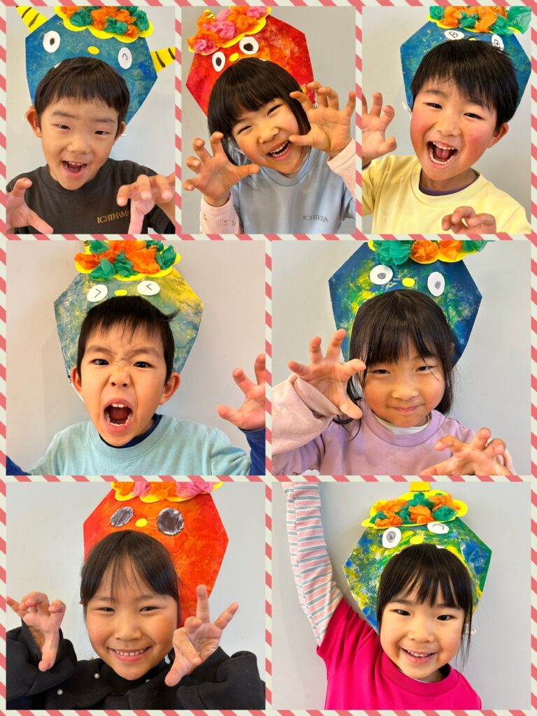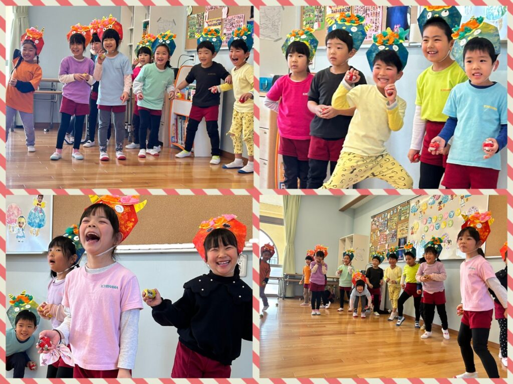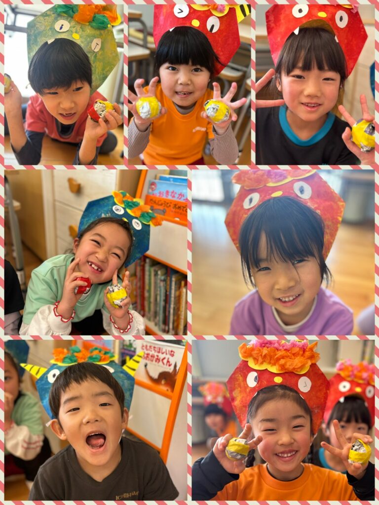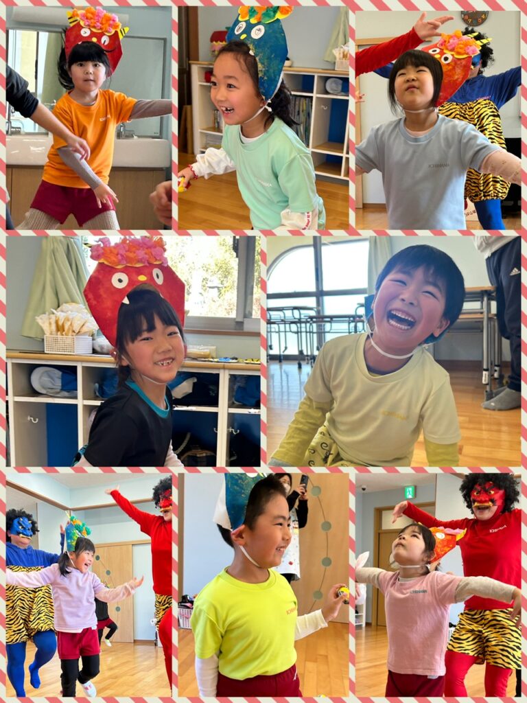 今日は節分ということで、、あお組さんにも鬼さんがやってきました👹🌟 今年の鬼は何色かなぁ〜??とみんなで予想する時間もすっごく楽しんでいたあお組さん🤣 鬼さんが来るまでは、なんか少し緊張する〜💦とドキドキしている子もいたようですが、ピアニカの音とともに現れた鬼さんにはびくともせず、真剣に走り回りながら豆を投げていたこどもたち🤣🤣💗 鬼さんと仲良くTigerとカリスマックスも踊ることができ、大満足なあお組さんでした😊  そして、、、給食の恵方巻きもしっかり「南南東」を向き、お願いごとをしながら食べることかできました💗 どんなお願いをしたかポロッと口に出してしまうところもこどもらしくってすごく可愛かったです🤭笑  自分の中にいる悪い鬼さんを退治できたと思うので😁 どうかああ組さんみんなに、たくさんの笑顔と幸せを運んでくれますように𓂃𓈒𓏸︎︎︎︎ 🕊