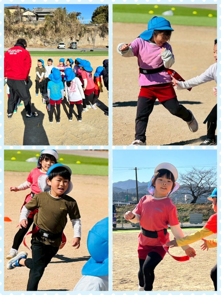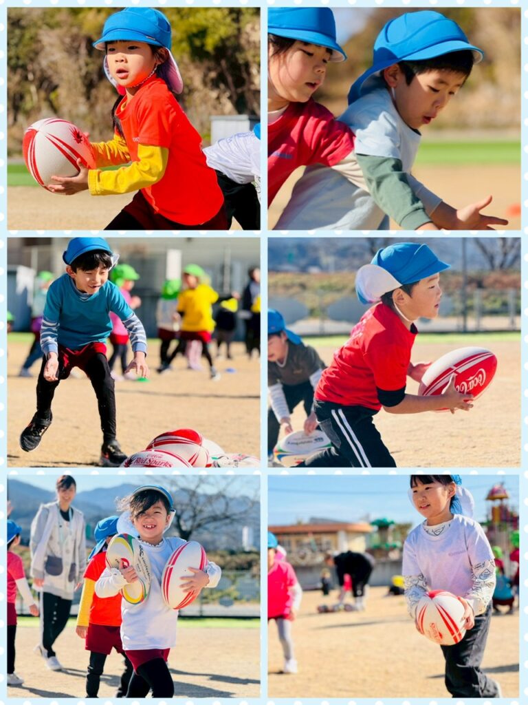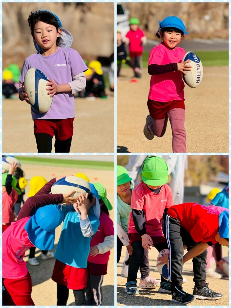 あお組さん、みどり組さん、きいろ組さんの3クラスでラグビー教室に参加しました✨