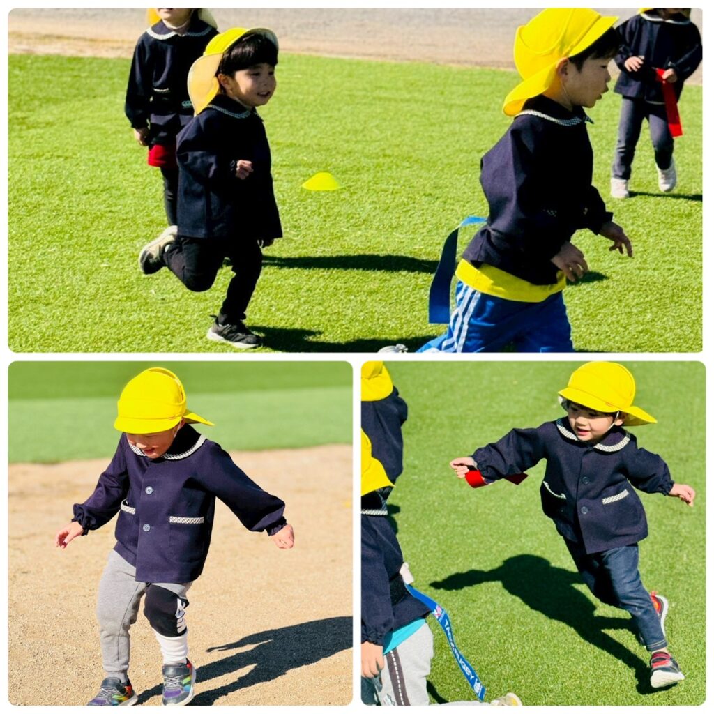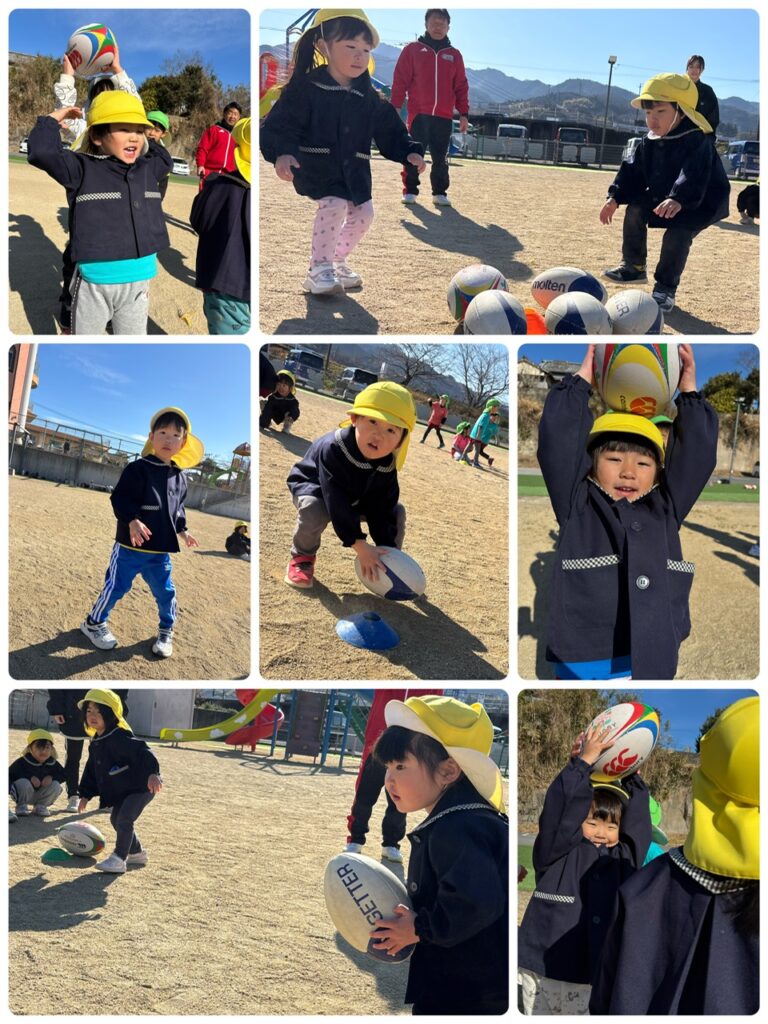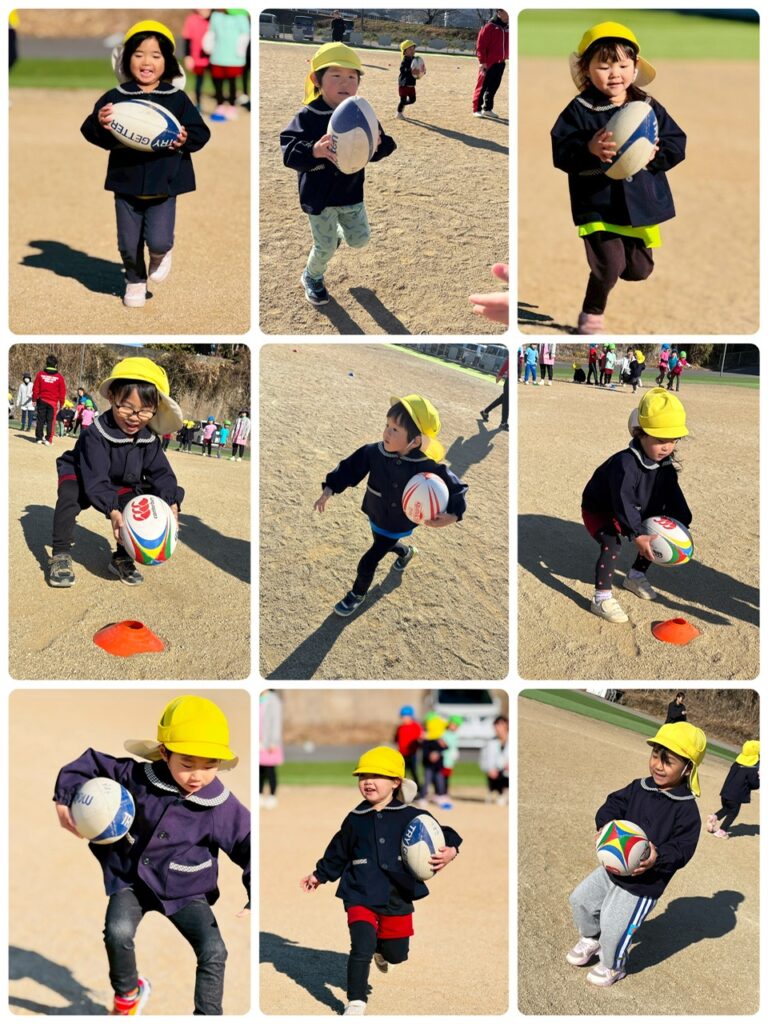 きいろ組 ラグビー教室🏉 2026.02.06 2/4(水)にラグビー教室がありました⭐️はじめて見るラグビーボールに興味津々なきいろ組さん!!あお・みどり組さんと協力してマーカーコーンを回るリレーをしたり、ボール渡しリレーをしたりと子どもたちはとても楽しそうでした😆丸いボールと違ってラグビーボールは落とすと思ってもないところに跳んでいくので、「まってー」っと追いかけている姿はすごく可愛いかったですよ❤️他にもしっぽ取りゲームやボール取りゲームなどもして、楽しいラグビー教室になりました😆✨ 2月5日の給食 前の記事 たのしかったぁ‼️🏉 次の記事