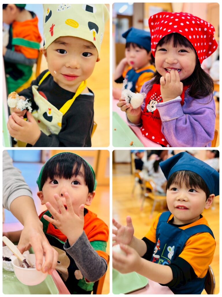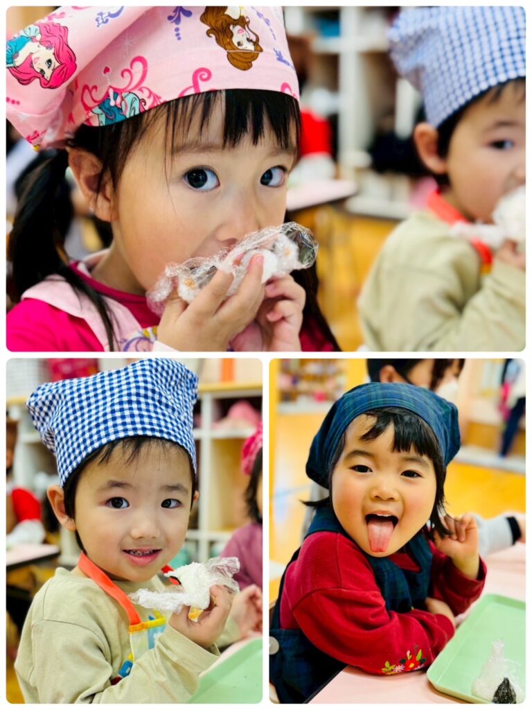 エプロンを身につけて、楽しそうにクッキングをする子どもたち。そして、とっても嬉しそうにおにぎりを食べるもも組さんでした😆💕(先生たちもみんなと一緒に美味しくいただきました✌️)