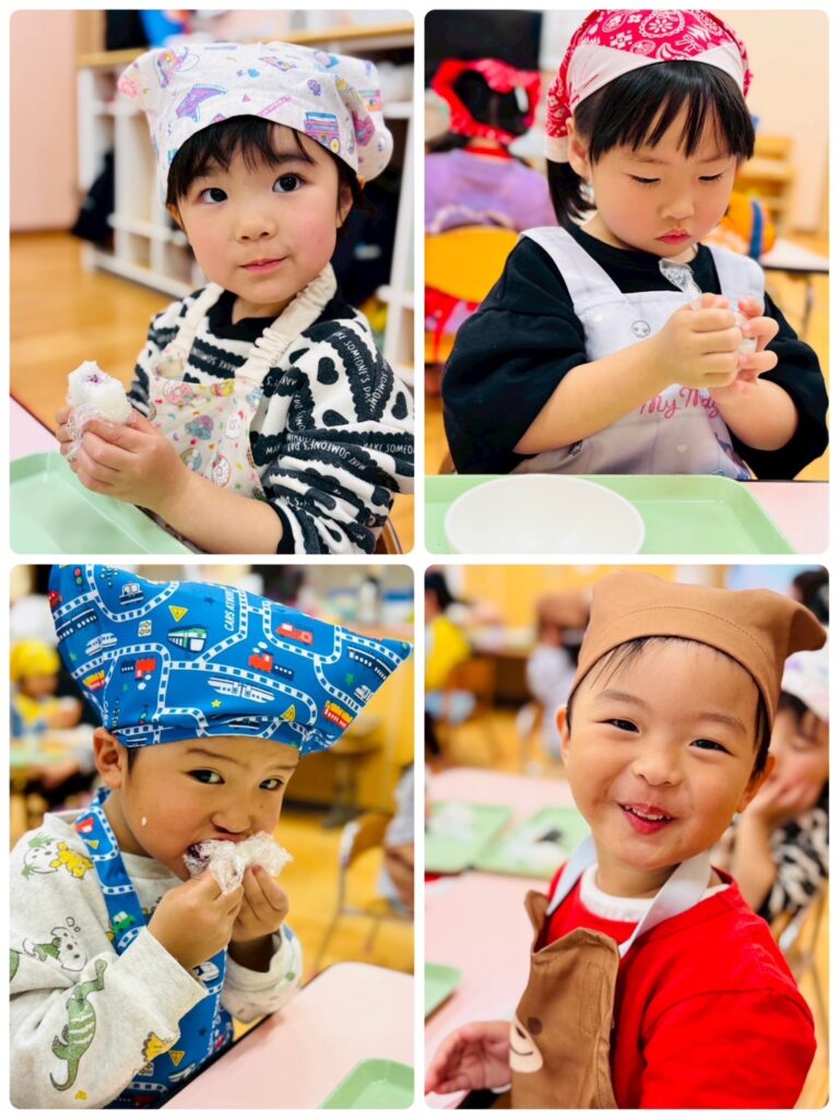 1月の毎日絵本「へんなおにぎり」が大好きだったもも組さん。そこで、今回は「へんなおにぎり」に因んで、おにぎりクッキングを開催しました✨