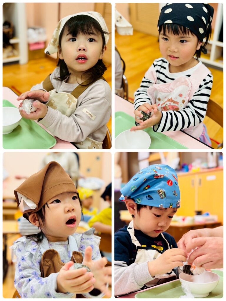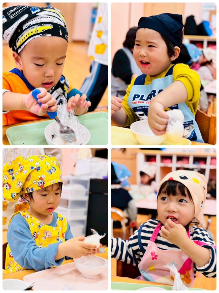 急な連絡ではありましたが、エプロンと三角巾の準備ありがとうございました。子どもたちのとても楽しそうなキラキラとした表情でいっぱいの時間になりました。もも組さんはおにぎり名人がたくさんいます!ぜひ、お家でもお子さんと一緒におにぎりを作って、おうち時間を過ごしてみてください😌💕