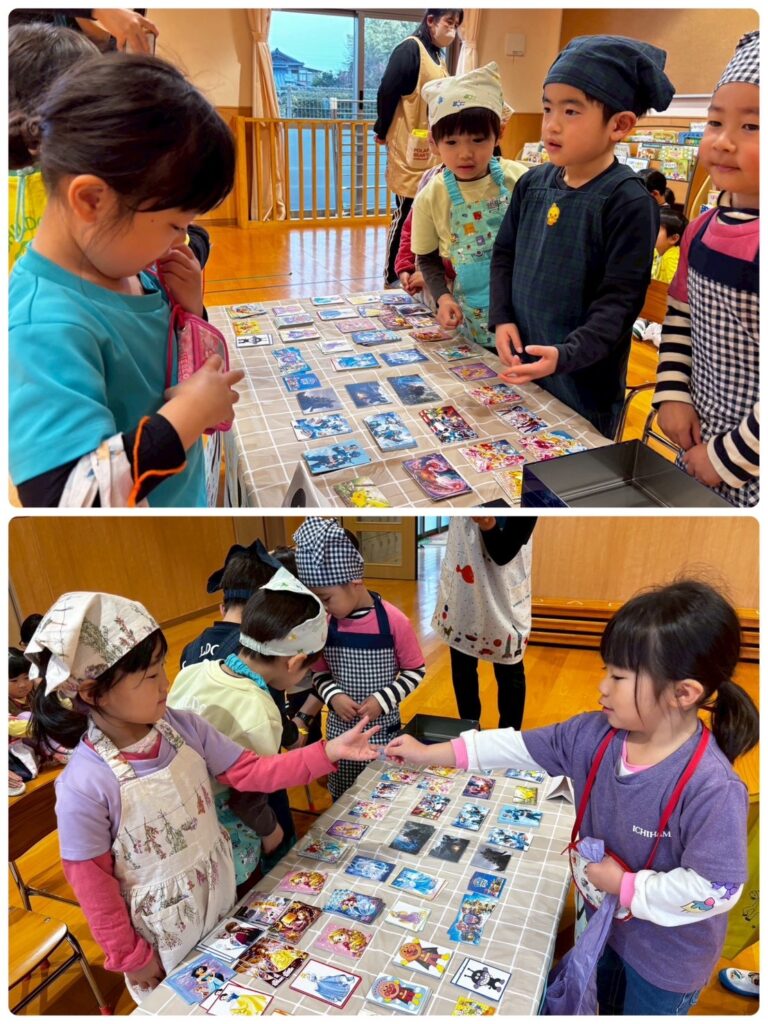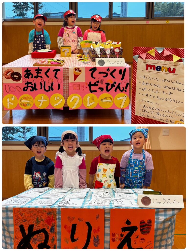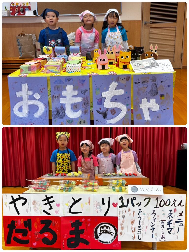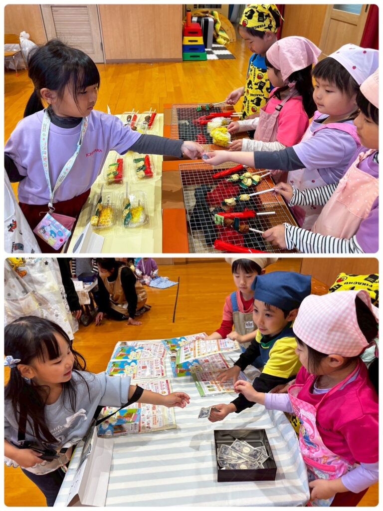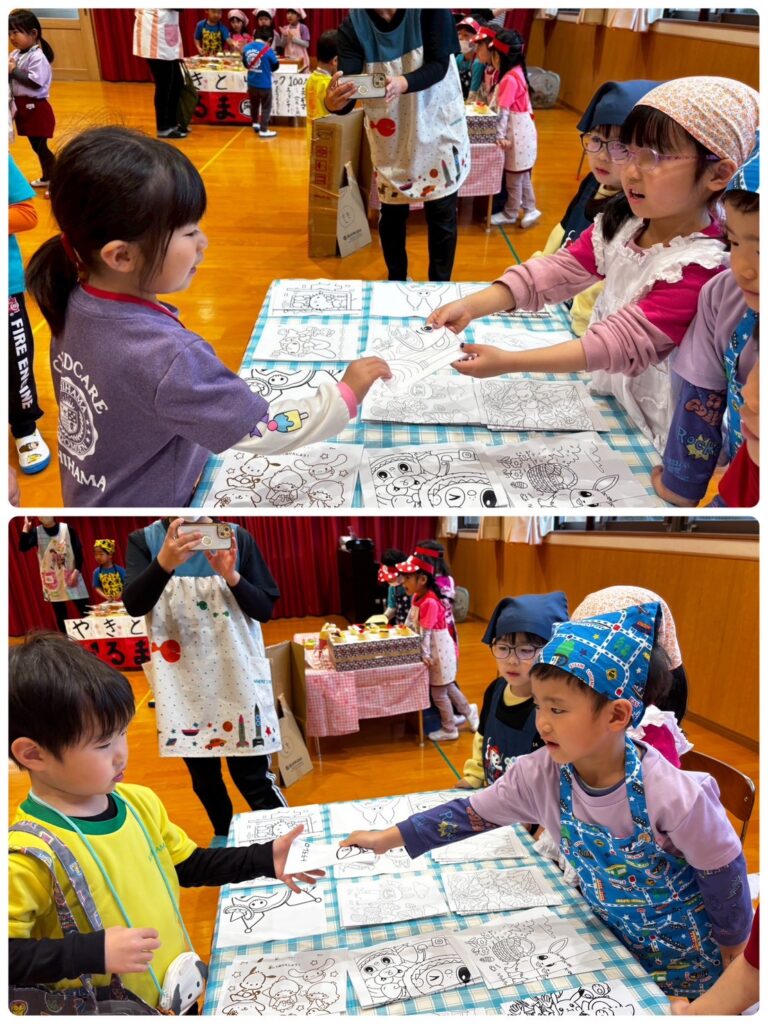 2月27日(金)にずっと楽しみにしていたお店屋さんごっこがありました🥰みどりぐみが担当ということでどんなお店を開きたいかみんなで話し合って決めました😊今年は、やきとり屋さんにクレープ・ドーナツ🍩屋さん、カード屋さん、ぬりえ屋さん、折り紙・クレヨン屋さん、おもちゃ🤖屋さんの6店舗を開きました!