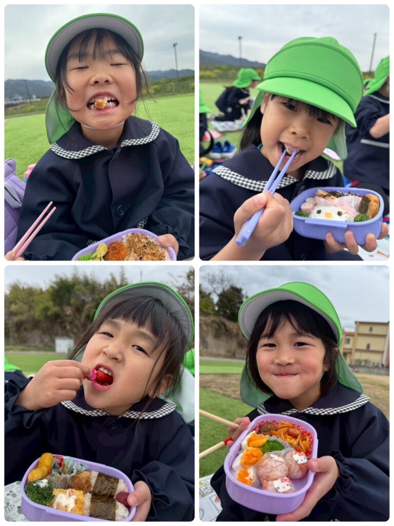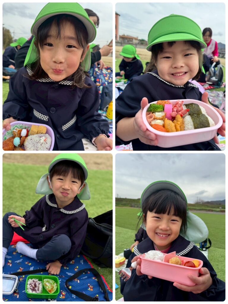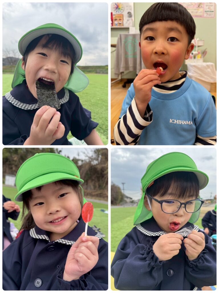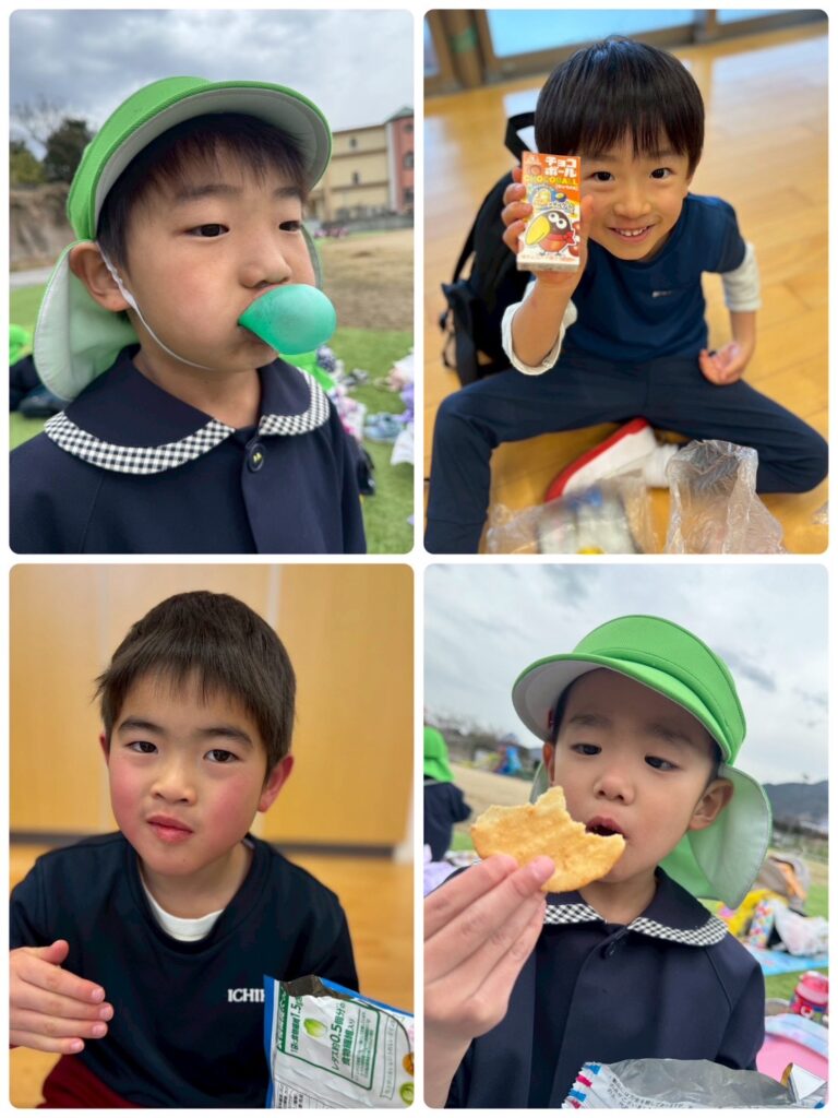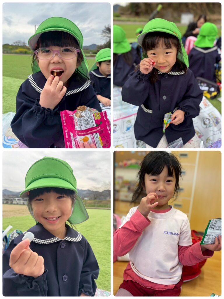 そして、ついに!!楽しみにしていたお弁当の時間🥰お弁当の蓋を開くと「わぁ!見て!〇〇が入ってる!」「ゼッツ!キティちゃん!」と口々にしとても嬉しそうな様子でした😊お腹が空いていた皆はあっという間にペロリと食べ😋🍴✨次はお菓子🍭🍬タイムです!!持ってきたお菓子をたくさん食べ楽しい時間を過ごしました♥️