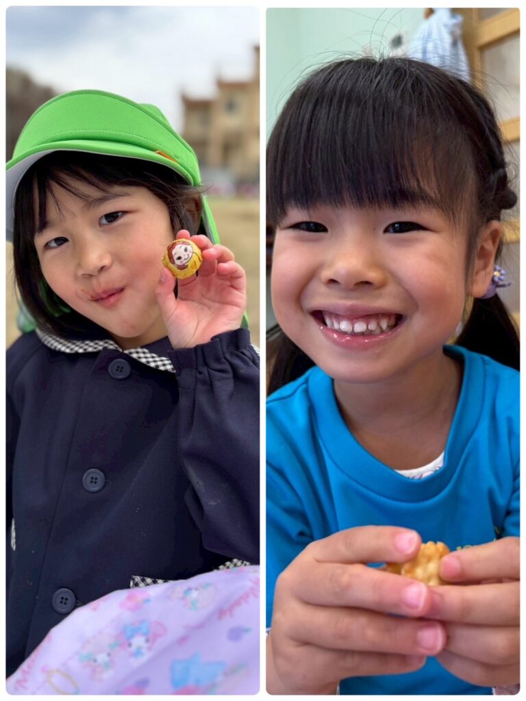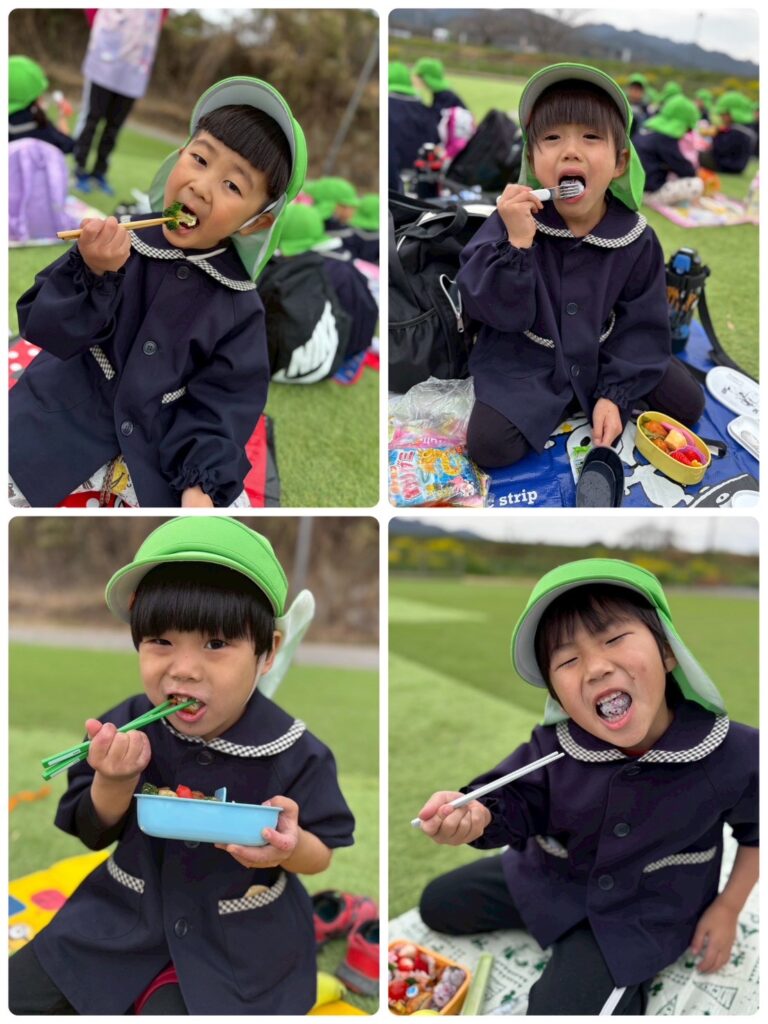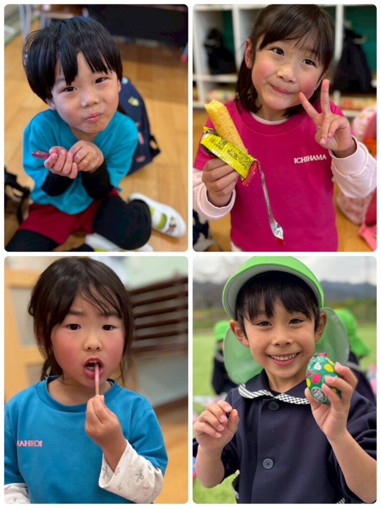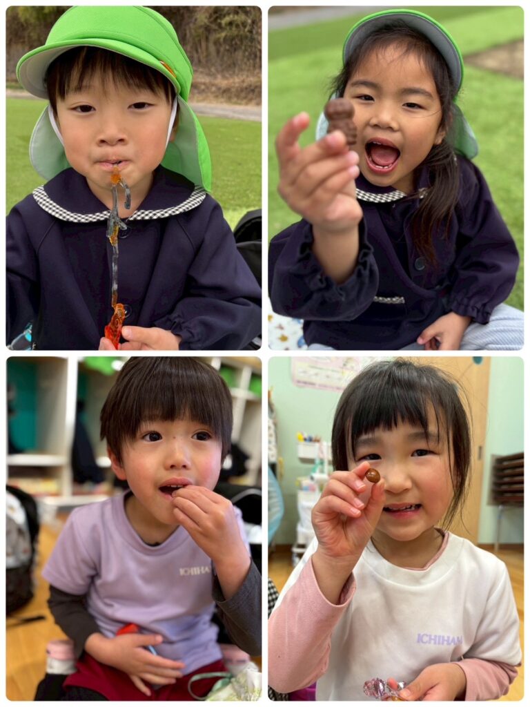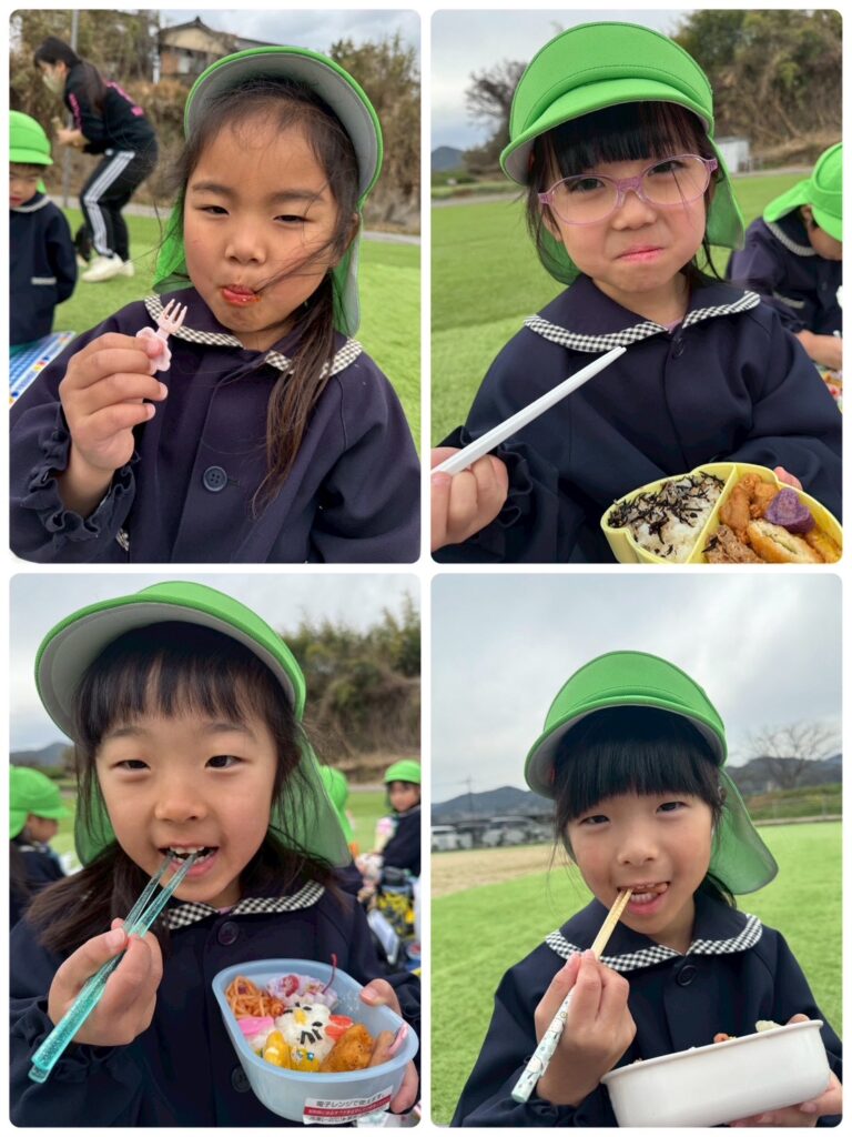 そして、ついに!!楽しみにしていたお弁当の時間🥰お弁当の蓋を開くと「わぁ!見て!〇〇が入ってる!」「ゼッツ!キティちゃん!」と口々にしとても嬉しそうな様子でした😊お腹が空いていた皆はあっという間にペロリと食べ😋🍴✨次はお菓子🍭🍬タイムです!!持ってきたお菓子をたくさん食べ楽しい時間を過ごしました♥️