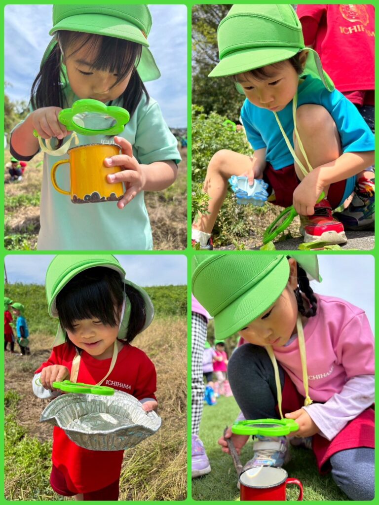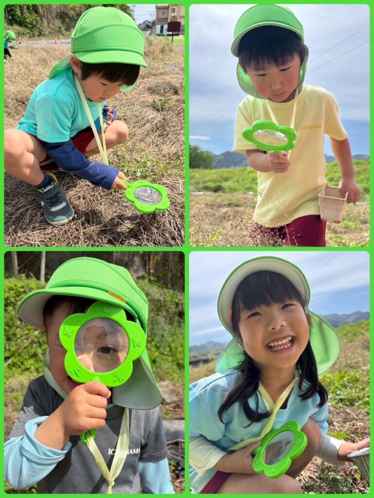 虫の体のしくみをよく見ることができるように虫眼鏡🔎と捕まえた虫を入れるカゴをそれぞれ選んで畑へ!!
