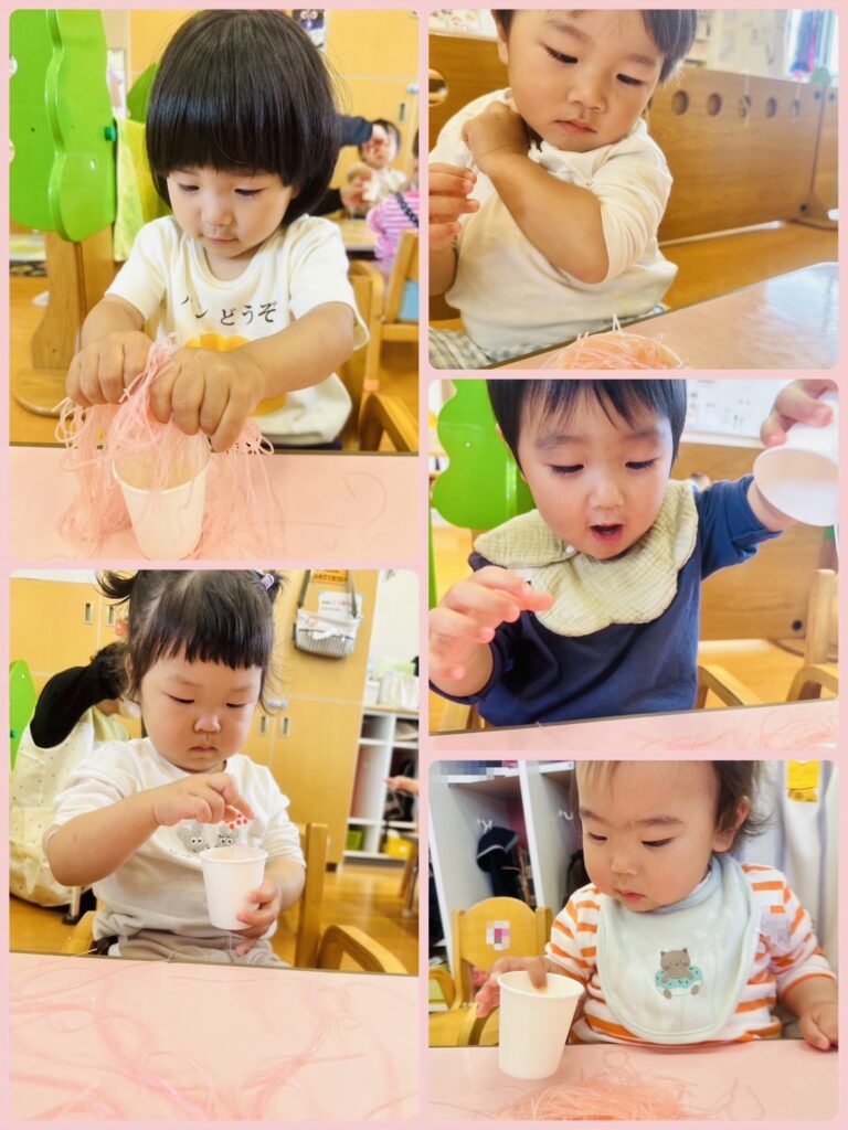 紙コップを用意するとな中に入れたり出したり、「いちごジュースでーす!」と保育者と一緒に見立て遊びを楽しむ姿もありました😊