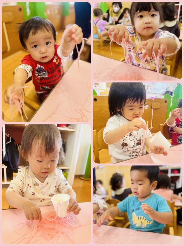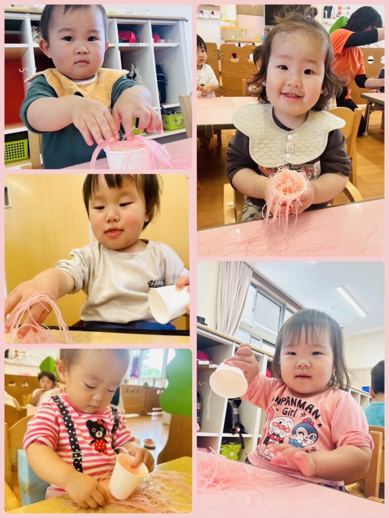 雨の日にはるさめを使って感触遊びをしました。目の前に出てきたはるさめに興味津々ないちご組さん🩷初めははるさめに警戒している子もいましたが、他のお友達が触っている様子を見て少しずつ楽しめるように、、🤭